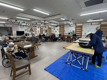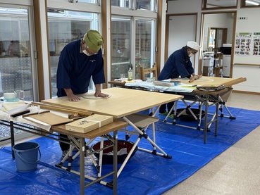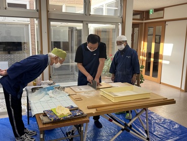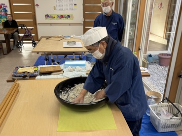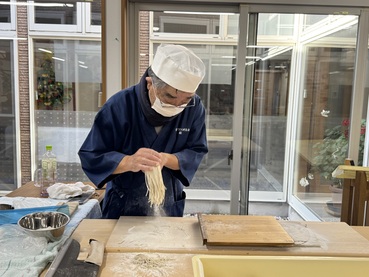蓬田村そば打ち研究会の皆さまにお越しいただき、そば粉から打ち立てのそばができあがるまでを間近で見せていただきました。